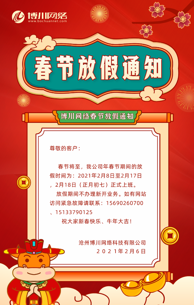 博川網(wǎng)絡(luò)2018年春節(jié)放假通知2018-02-13 11:40
